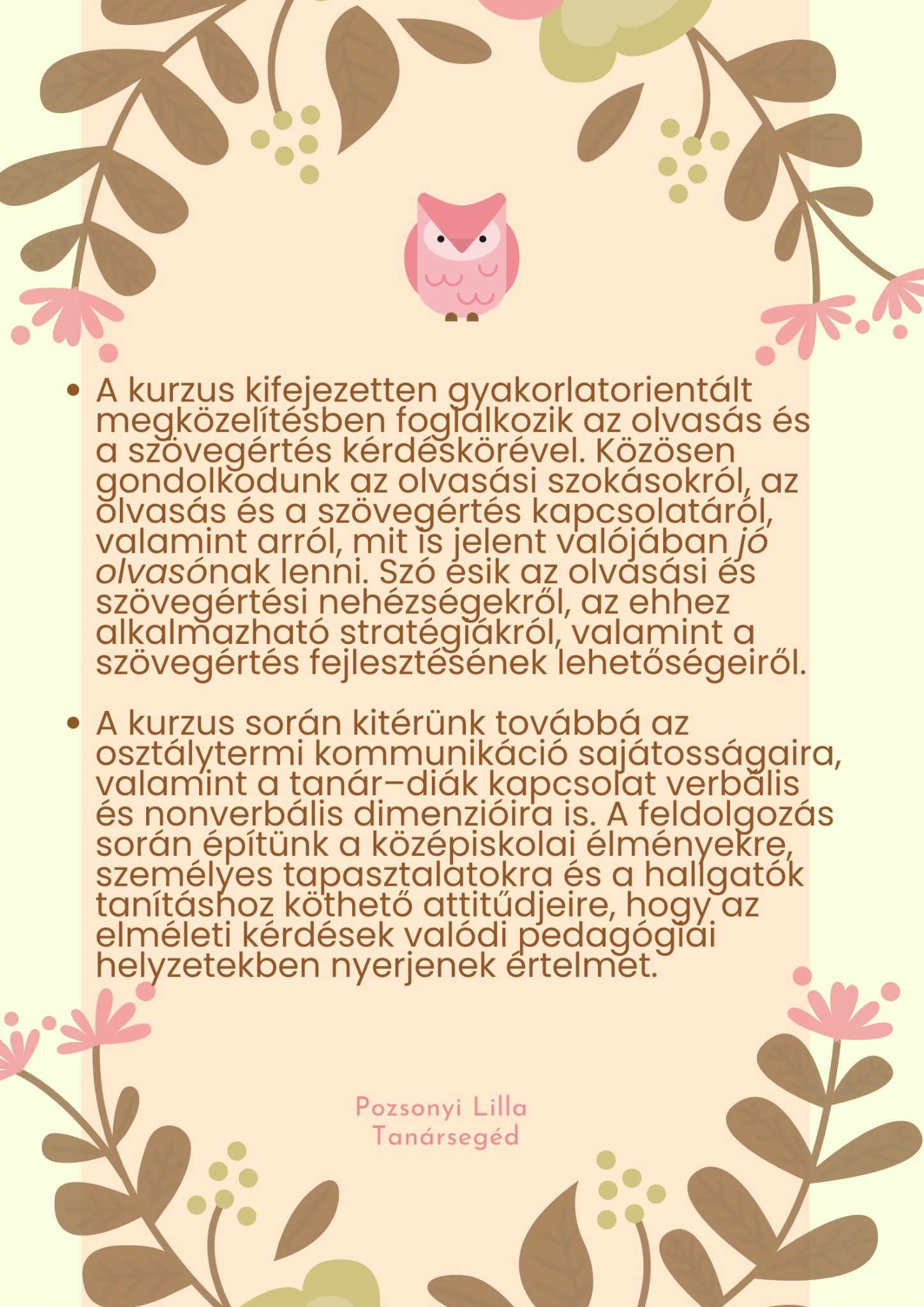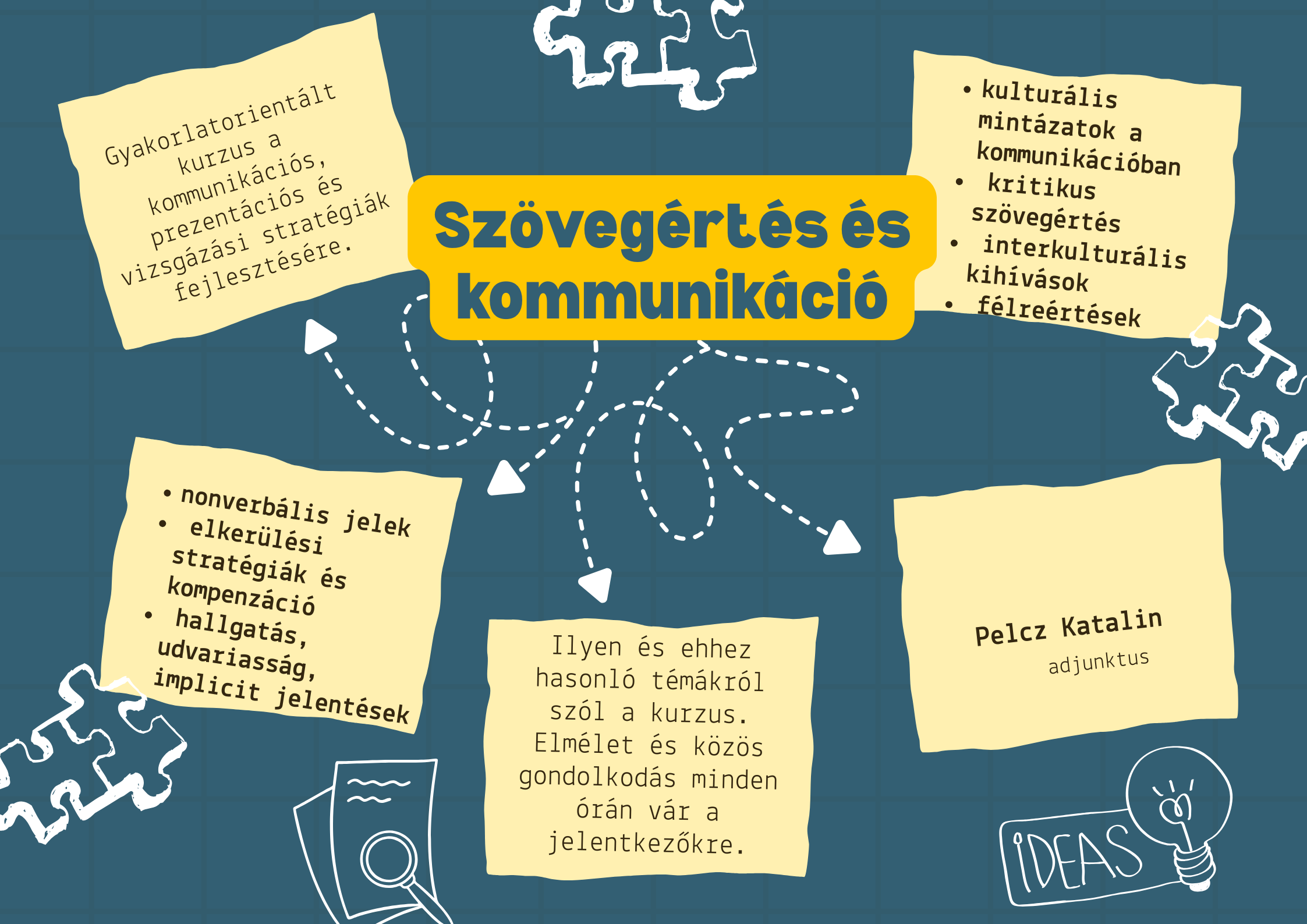 A Szövegértés és kommunikáció c. kurzus minden elsős osztatlan tanári képzésben részt vevő hallgatónak kötelező. A Szövegértés és kommunikáció mindig tavaszi félévekben kerül meghirdetésre.